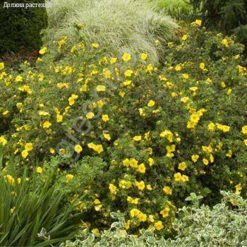 Лапчатка кустарниковая или Курильский чай кустарниковый – наиболее распространенный представитель группы кустарниковых лапчаток, произрастающий в холодных частях северного полушария - Северной Азии, Северной Америке и в Европе. Это выносливый, обильно цветущий, компактный, густой кустарник, усыпанный с поздней весны до первых заморозков массой насыщенно-желтых цветов диаметром около 2-3 см, и характерными перистыми, пальчатыми листьями обычно с пятью эллиптическими листочками на каждом. Многоствольный и ветвистый, высотой от 30 см до 2 м, в альпийских районах он чаще имеет подушковидную форму.