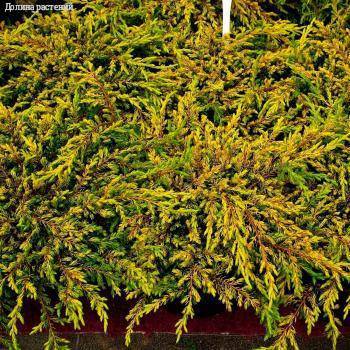 Можжевельник обыкновенный Голдшатц – низкорослый почвопокровный кустарник. Его высота около 30 см, ширина – до 150 см. Крона раскидистая, перистая, несколько асимметричная, образована длинными побегами. Хвоя игольчатая, мягкая, толстая, летом золотистая, в конце сезона буреет. Можжевельник устойчив к морозам. Хорошо адаптируется к городским условиям. Используется как почвопокровное растение в каменистых и вересковых садах, композициях с кустарниками и многолетними травянистыми.