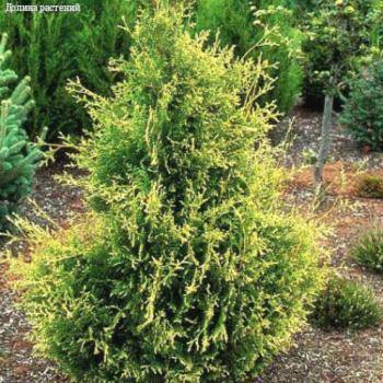 Туя западная Голден Тип – деревце с конической правильной кроной, с жесткими побегами, сильнорослое – в возрасте 10 лет дерево достигает 3 м. Ежегодный прирост 5-7 см. Отличается красивой золотисто-кончиковой формой с блестящими веточками, густозолотистыми на концах. Хвоя плотно расположена, чешуевидная, от ромбовидной до яйцевидной (0,3-0,7 см), кожистая, блестящая, от ярко-светло-зеленого до средне-зеленого цвета, кончики желтые, зимой с медно-красным оттенком. Зона морозостойкости – 4. Сорт нуждается в плодородных и влажных почвах. Туя западная Голден Тип довольна теневынослива. Рекомендуется при создании живых изгородей и шпалер. Густота посадки в ряду 0,8-1 м.