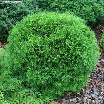 Туя западная Тини Тим – карликовый плотный кустарник шаровидной формы, растущий медленно. В возрасте 10 лет вырастает до 30-50 см в высоту и до 40-60 см в ширину. Хвоя мягкая, изумрудно-зеленая, а зимой бронзовая. Туя предпочитает солнечные места, плодородные влажные почвы и мульчирование. В сухую и жаркую погоду требует обильного полива. Идеально подходит для альпинариев и композиций в контейнерах.
